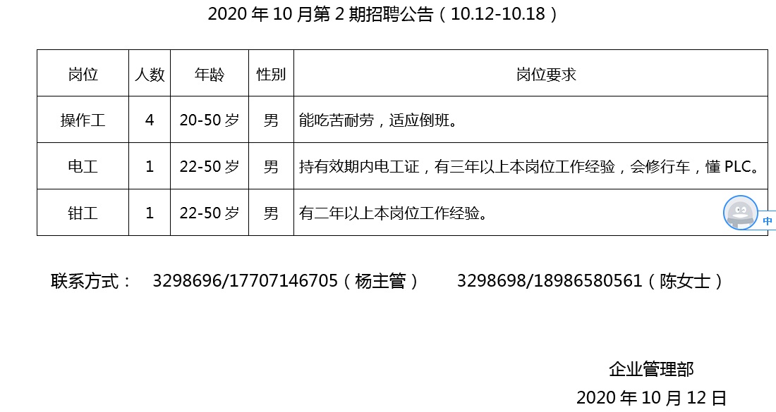 2020年10月第2期招聘公告