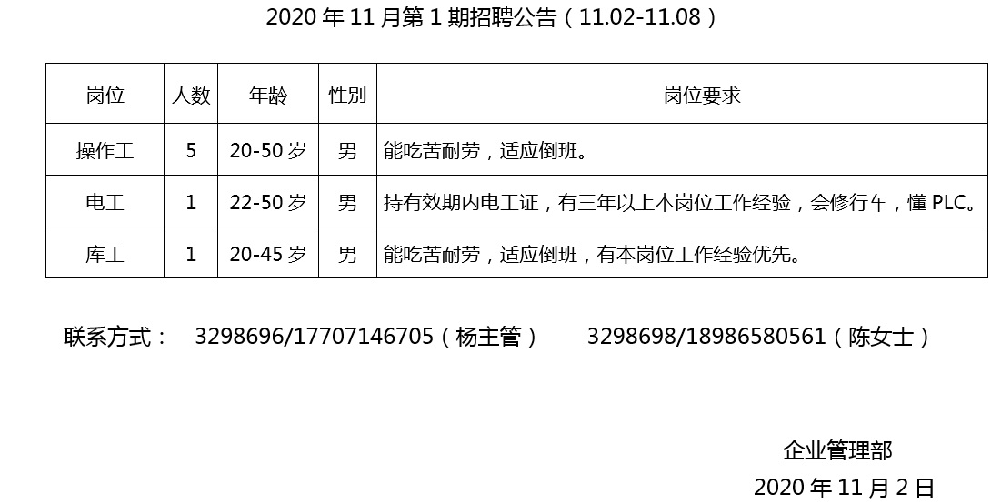 2020年11月第1期招聘公告