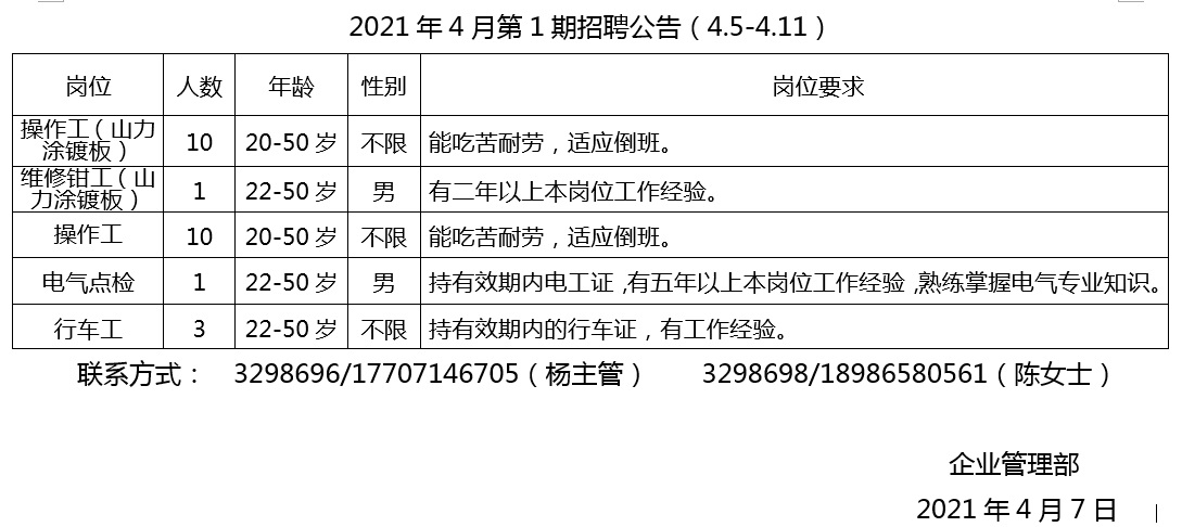 2021年4月第1期招聘公告