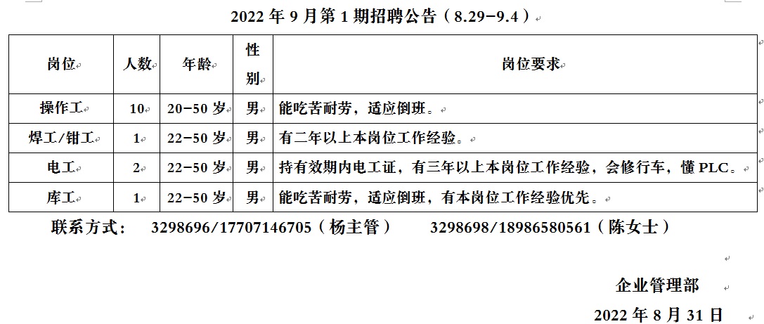 2022年9月第1期招聘公告