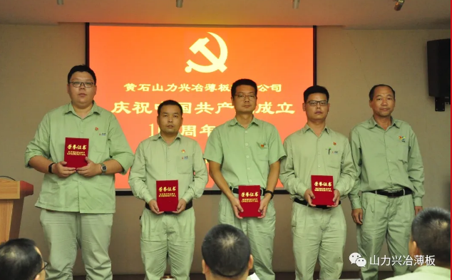 2021年7月1日,山力兴冶薄板公司召开庆祝中国共产党成立100周年大会。会议表彰了公司2020-2021年度优秀共产党员、优秀党务工作者和先进党支部。6名预备党员举行了宣誓仪式。优秀共产党员代表、预备党员代表分别发言。与会人员观看了《中国共产党百年述职报告》。会议开始时,全体与会人员高唱国歌,会议在高唱《没有共产党就没有新中国》的旋律中结束。